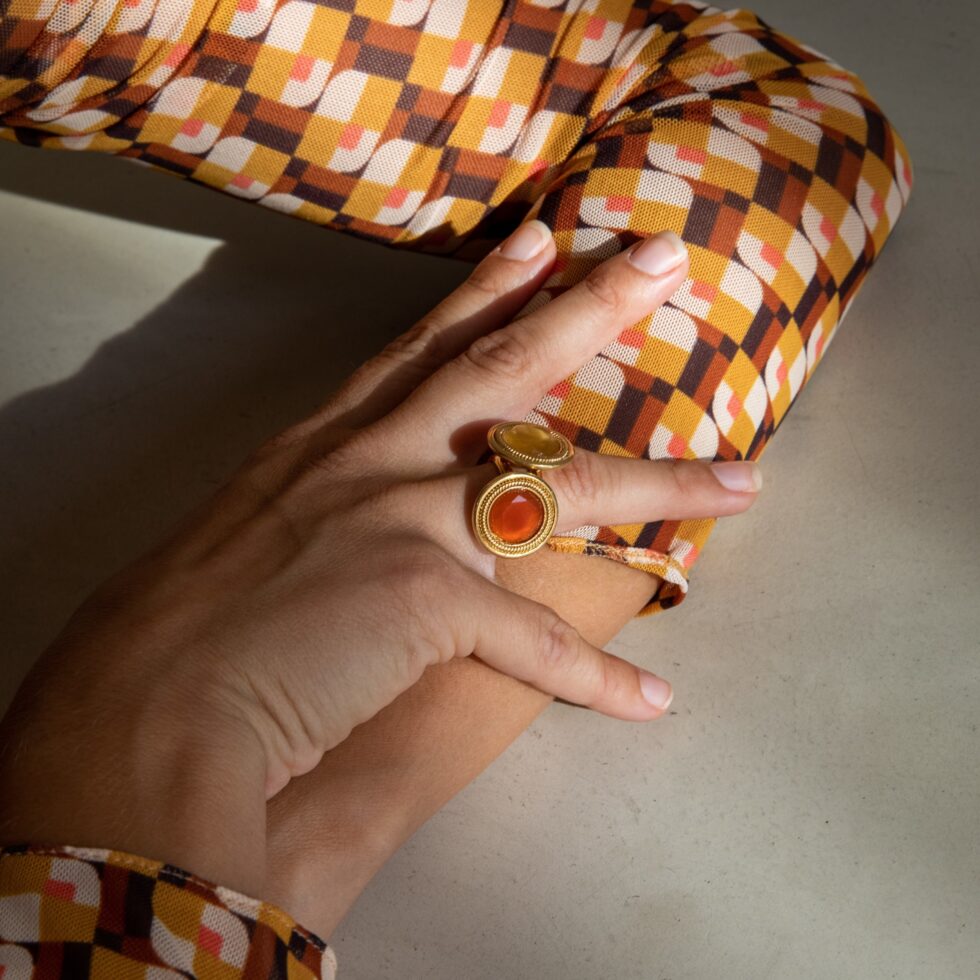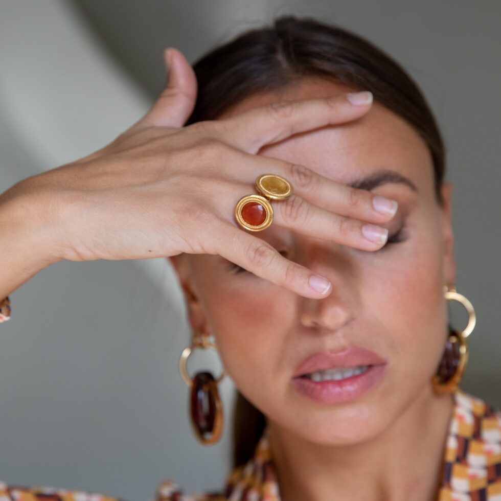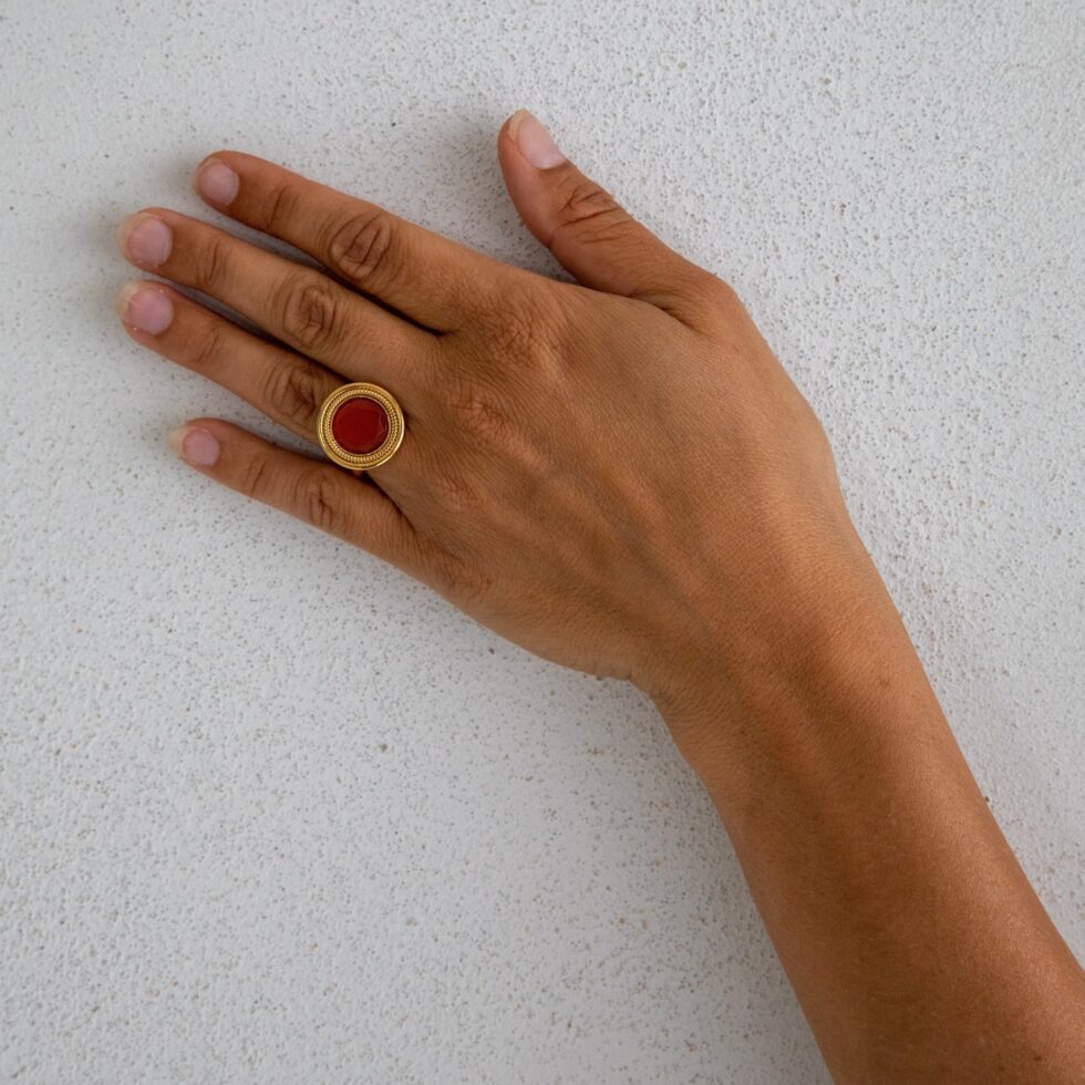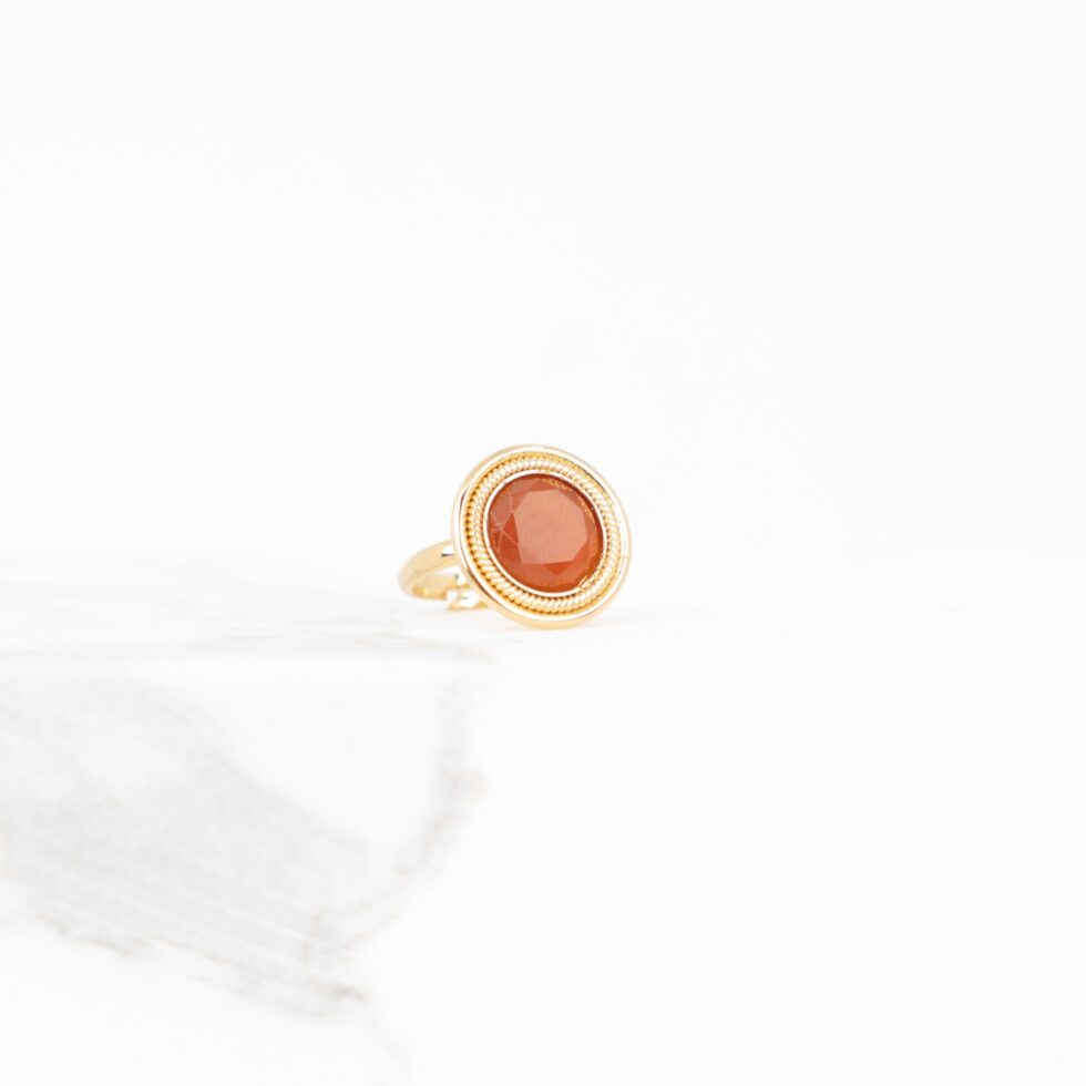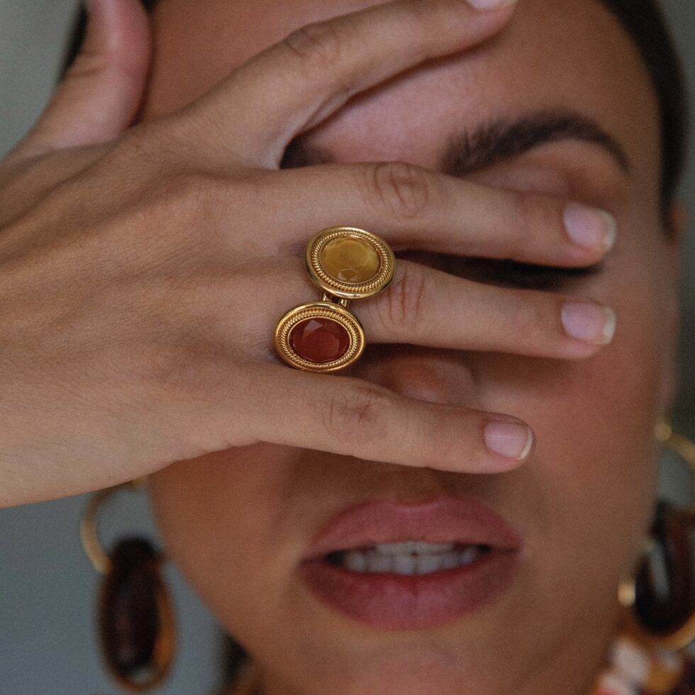 24K vergulde ring afgewerkt met een uniek en verfijnde rand voor een vintage look. Elke ring heeft onze herkenbare one-of-a-kind sprankelende gefacetteerde glassstenen. Draag deze ring apart of mix en match met andere kleuren.