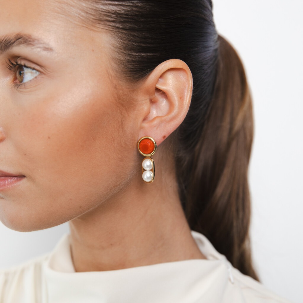 Halflange oorbellen in 24 karaat verguld edelstaal en strass. Afgewerkt met de klassieker, nl de ivoorkleurige parel.