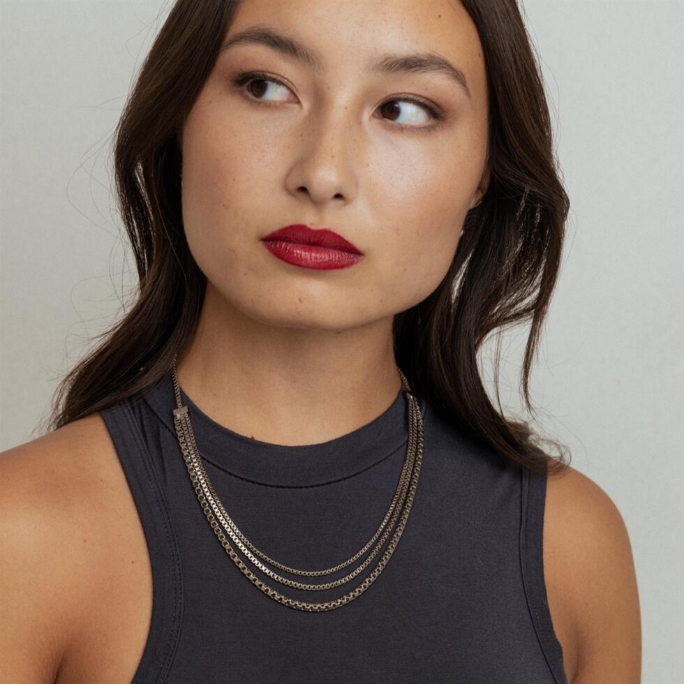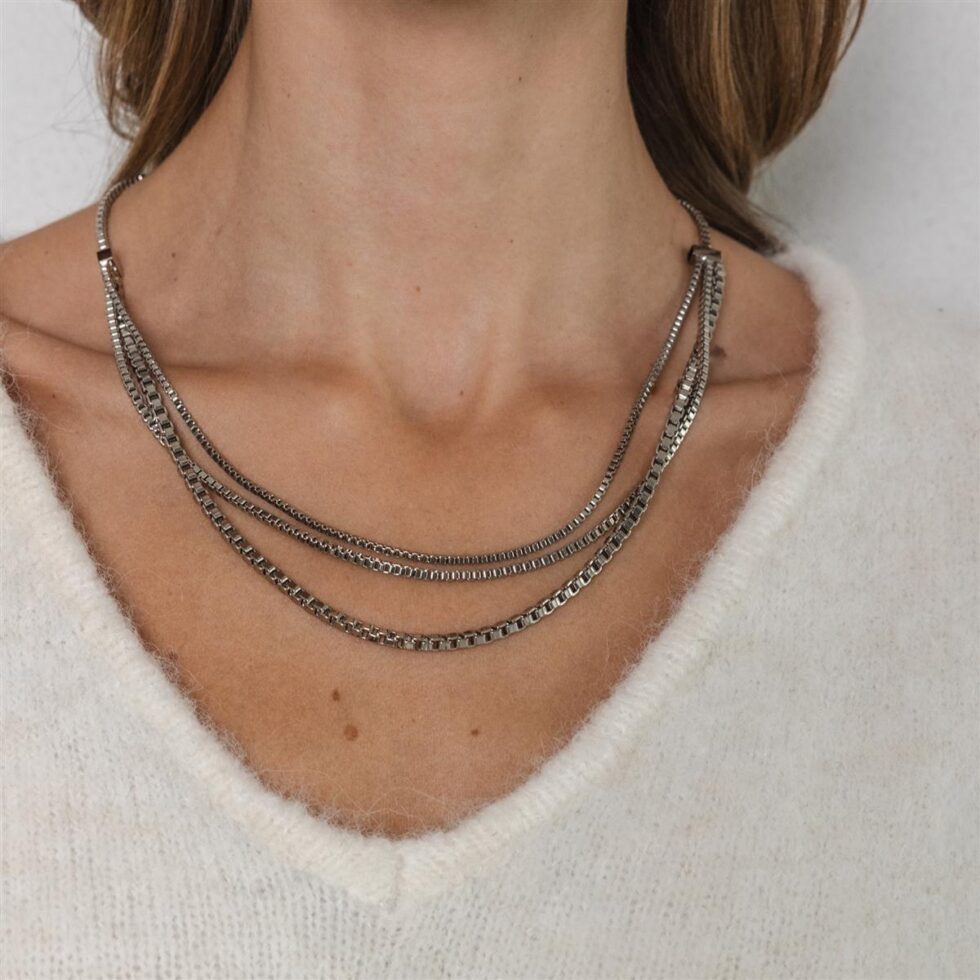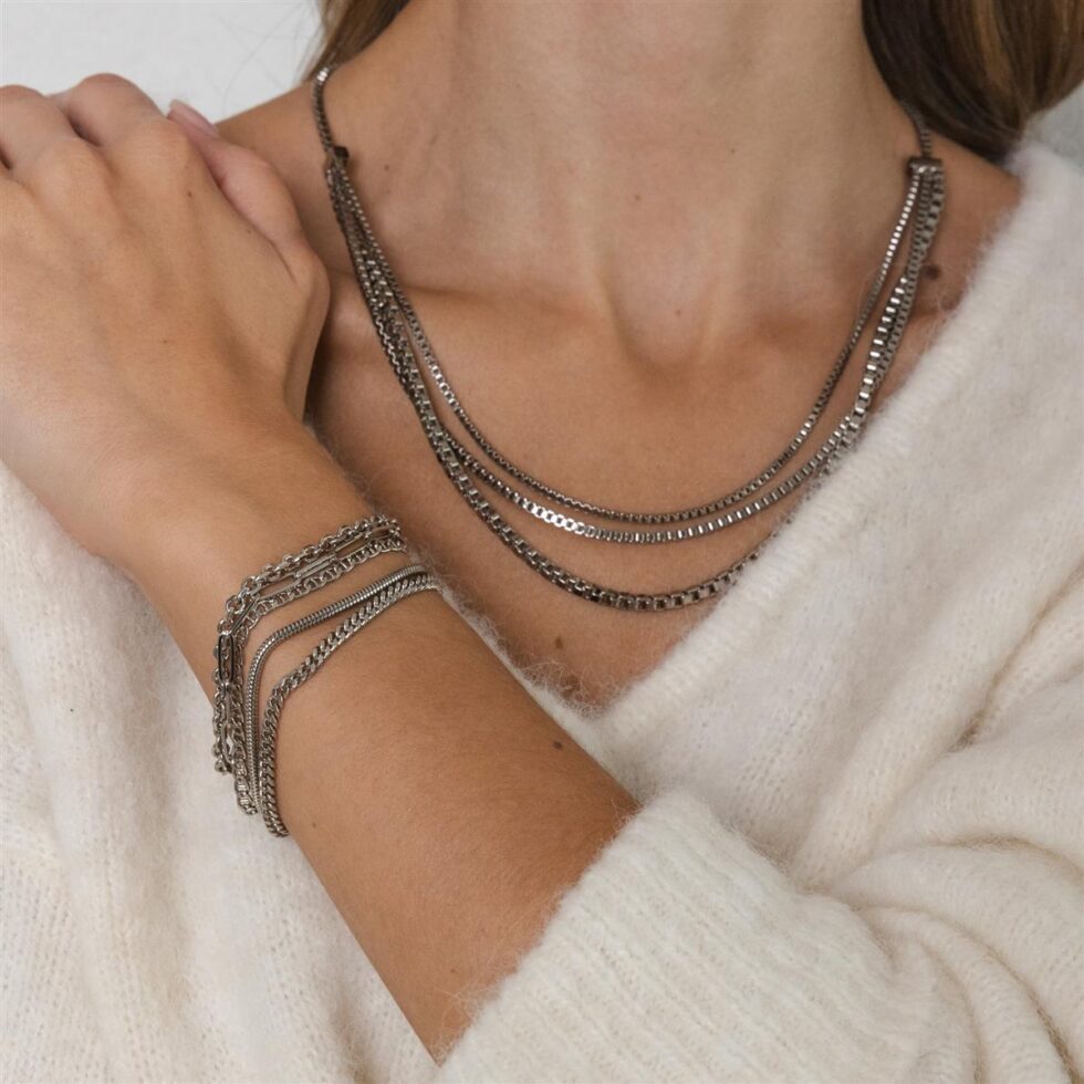 Een krachtig statement-stuk dat gedurfde elegantie en moderne stijl belichaamt. Met luxe kettingen in jouw keuze van goud of palladium, is deze ketting ontworpen met gelaagde elementen die een gedurfde en dynamische uitstraling creëren.