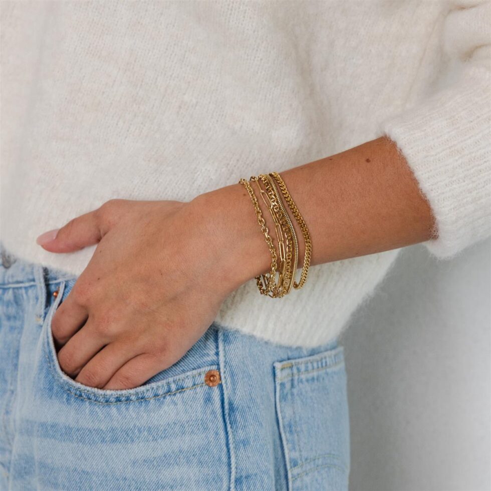 Verhef je stijl met de Fusion-armband, een schitterend stuk dat elegantie mengt met gedurfdheid. Gemaakt van verfijnde kettingen, maakt deze armband een opvallende statement terwijl hij een verfijnde uitstraling behoudt.