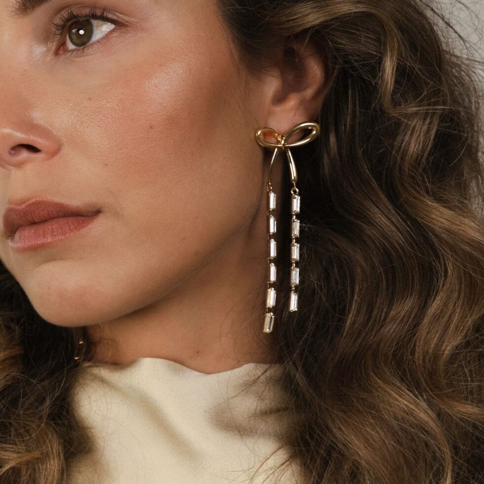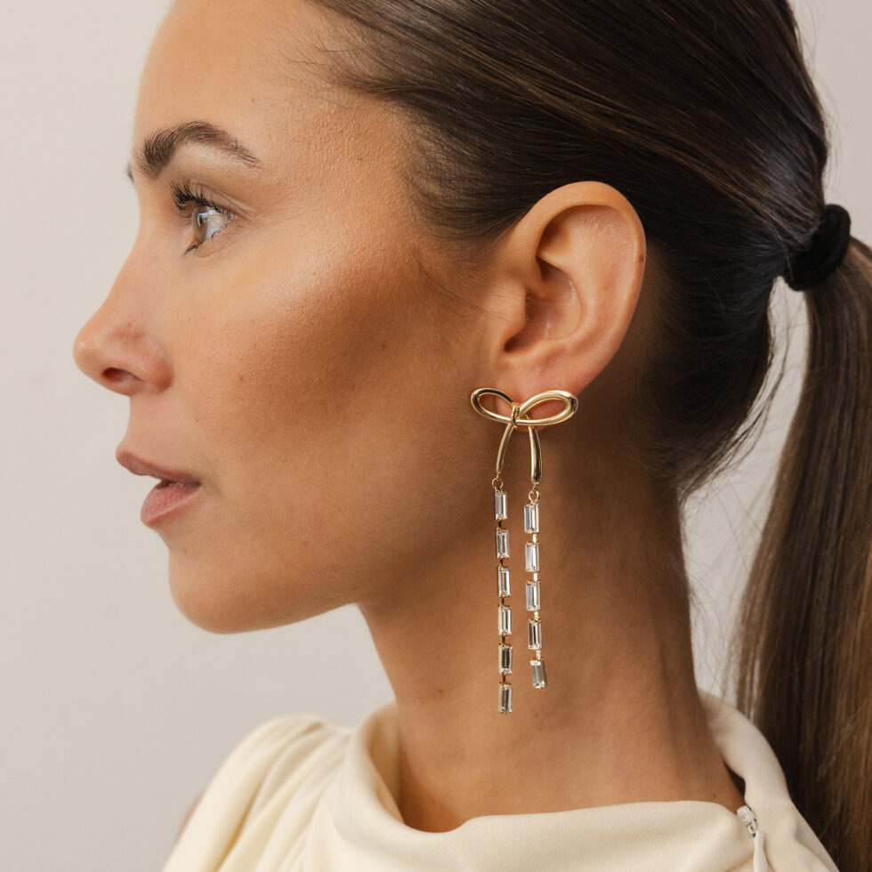 De oorbellen zijn afgewerkt in warm goud en het contrast tussen gepolijst metaal en glanzende kristallen zorgt voor evenwicht en verfijning in het ontwerp. De Lazo-oorbellen zijn een opvallend accessoire dat zowel overdag als ‘s avonds moeiteloos elke outfit verrijkt met ingetogen luxe.