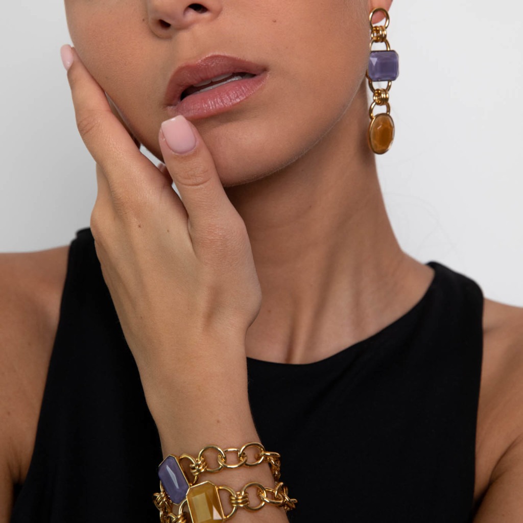 vergulde messing en prachtige gekleurde glasstenen uit Tsjechië, vertelt het