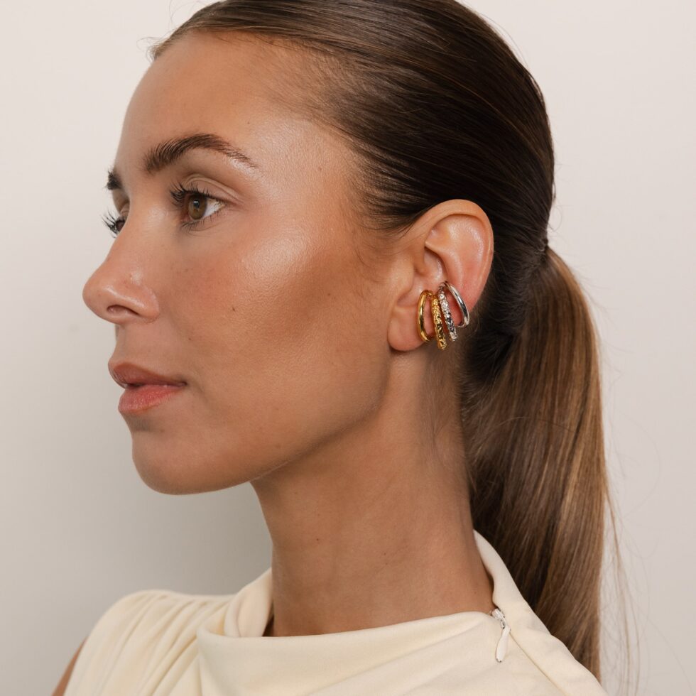 Verkrijgbaar in rhodium, verguld of bicolor, zijn deze earcuffs ontworpen voor moeiteloze veelzijdigheid — een hedendaags statement dat trends overstijgt.