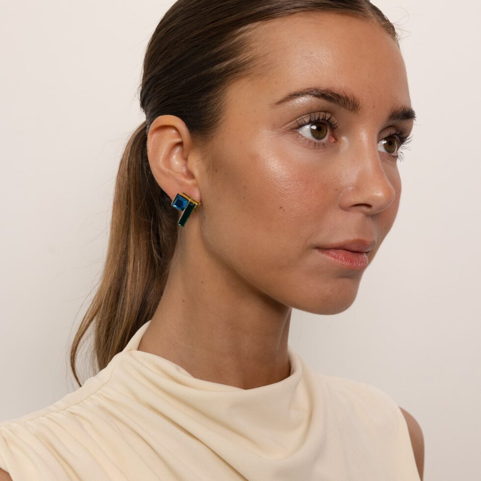 Modern geometrie ontmoet tijdloze glamour in de Romy oorbellen. Ontworpen met rechthoekige, gelaagde silhouetten versierd met glanzende glasstenen in cognac, bordeaux en blauw, vangen deze oorbellen bij elke beweging het licht.