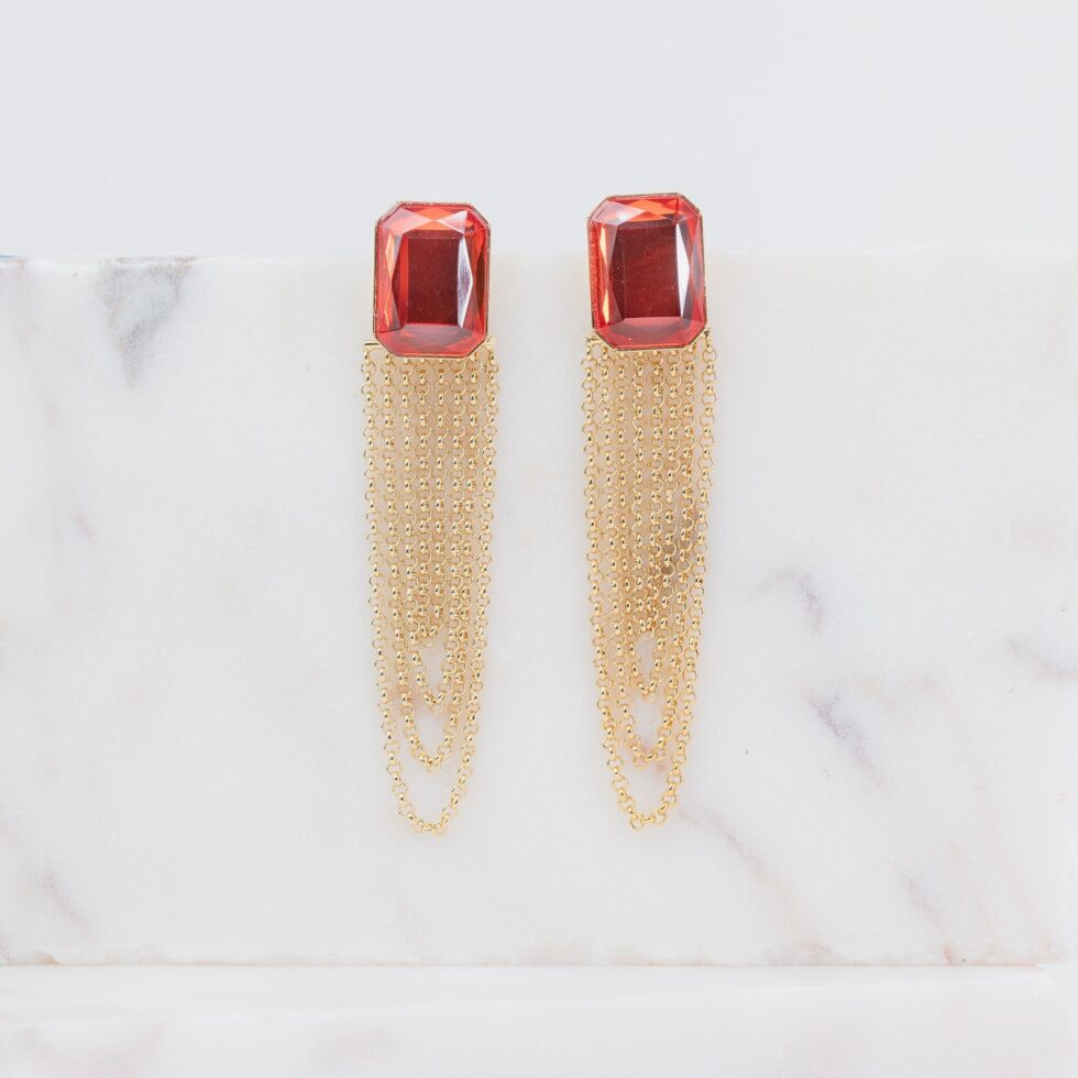 Crafted with meticulous attention to detail, these earrings feature exquisite chains that cascade gracefully, reminiscent of the carefree vibes of a summer escape. The glass stone adorning the top adds a touch of sophistication, reflecting the sparkle of the