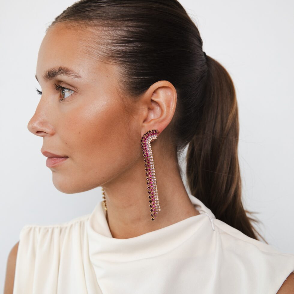 The “Cielo” earrings are the perfect mix of sophistication and glamour. With their soft, curved shape and beautiful long rhinestone chains, they add a touch of luxury to any outfit. These earrings effortlessly take any party outfit to the next level and make you shine like the stars in the sky. Available in long and shorties.
