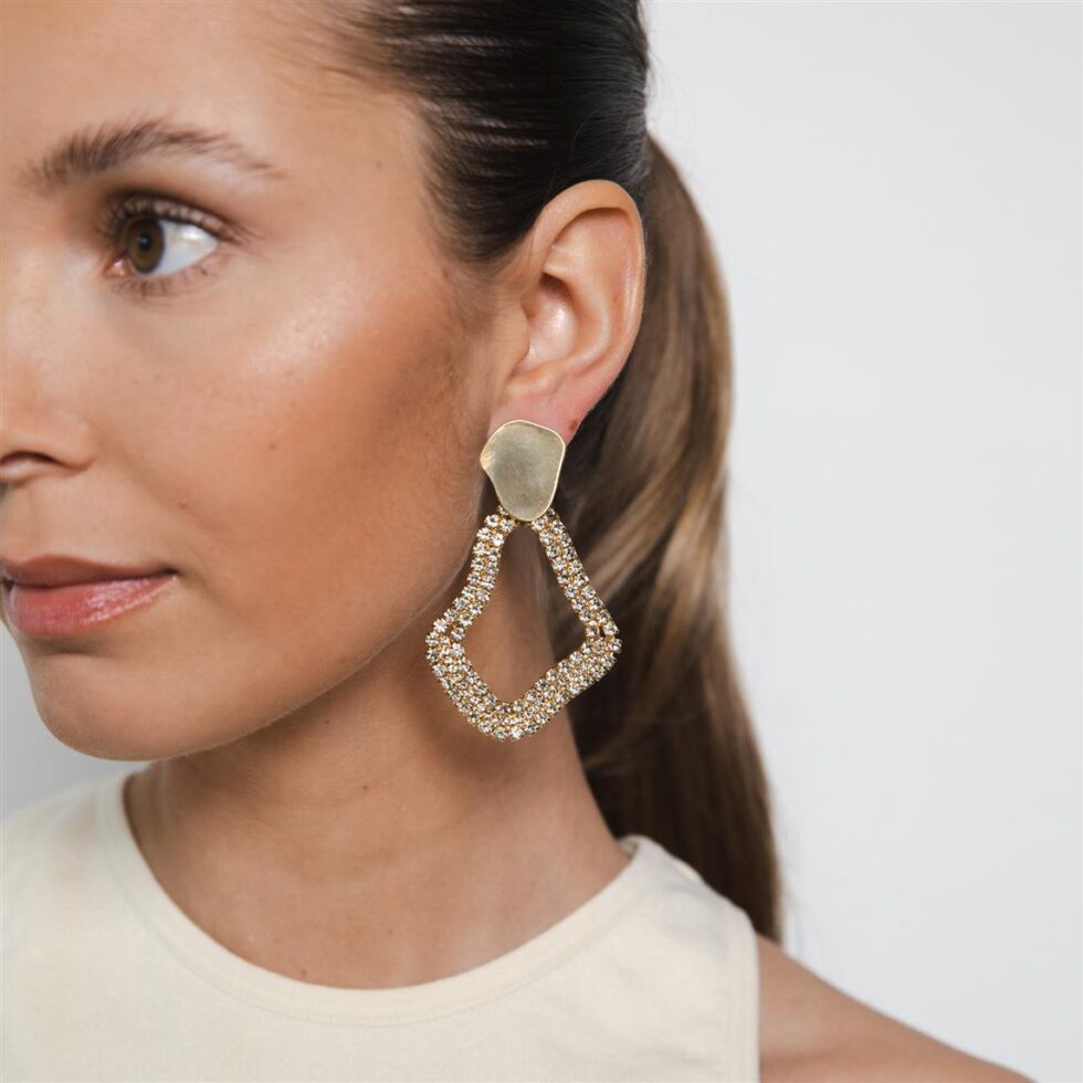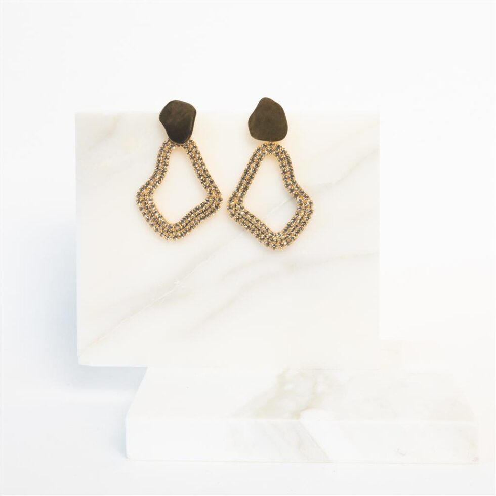 Lights, camera, action – the Giri strass earrings make a dazzling statement! With its gold plated brass, completed with refined Swarovski’s crystals in diverse colors, this pair has everything in store to drop jaws and capture hearts. From its artful shape to its unique texture play, the Giri will leave you drowning in its