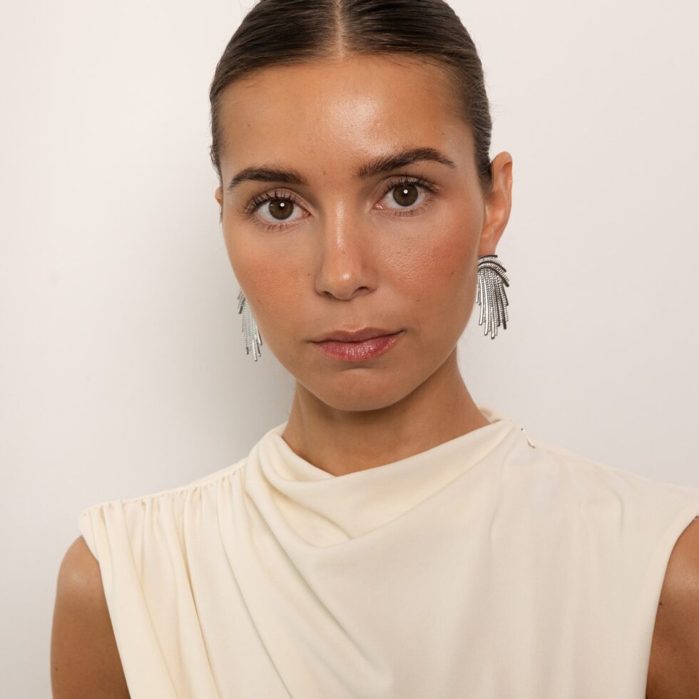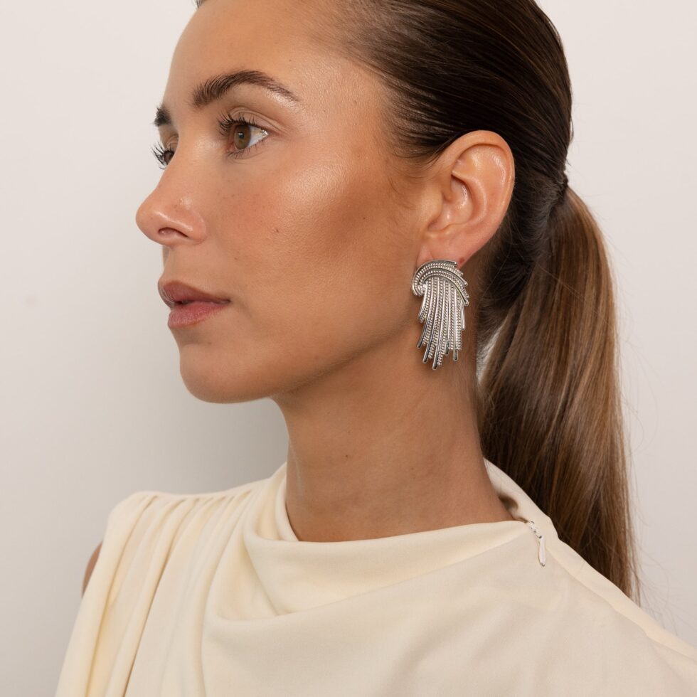 The Helia Silver Earrings embody timeless sophistication and sculptural grace. Crafted with a platinum finish, their cascading design evokes the elegance of Art Deco glamour, reimagined for the modern muse. Each curved strand catches the light with subtle brilliance, creating a refined sense of movement and depth.