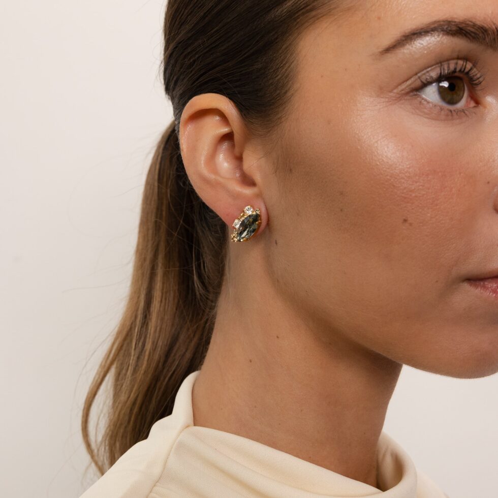 Delicately arranged on a gold-toned base, the stones shimmer with subtle brilliance, evoking a sense of effortless sophistication. Compact yet striking, these earrings add a refined touch to both everyday ensembles and evening attire.