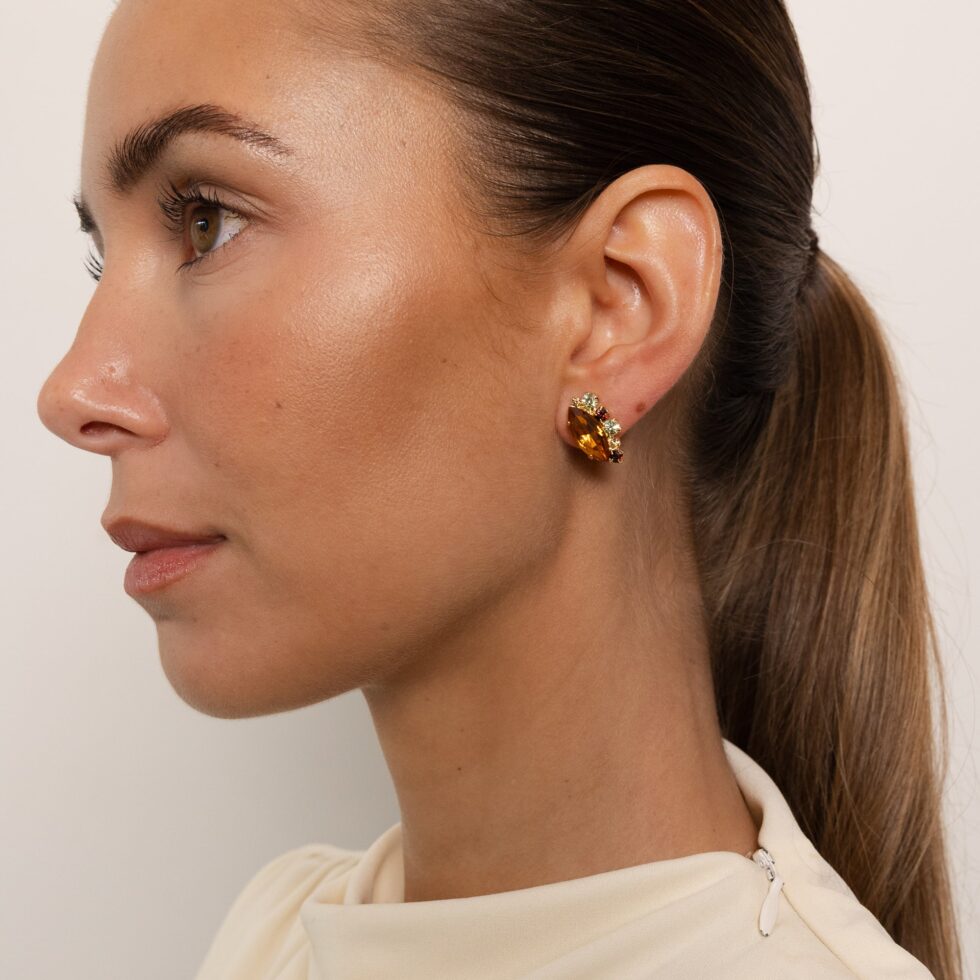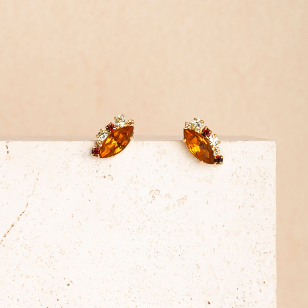 The Iris Short Earrings capture the perfect balance of color and luminosity. Designed with faceted glass stones, each piece glows with captivating depth, available in rich Cognac, Burgundy, Green, and Blue hues.