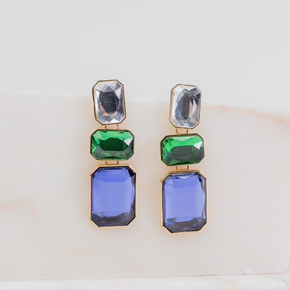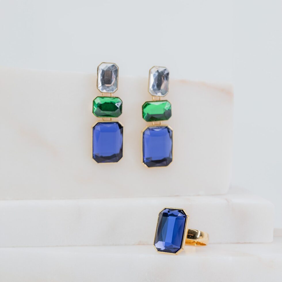 Introducing the exquisite JUNE family, a harmonious ensemble that includes the captivating statement earrings, an elegant shortie, and a matching ring, adorned with stunning glass stones and a lustrous 24k gold finish. Each piece in this enchanting family resonates with the very essence of summer, infusing a breath of fresh air into your jewelry collection.