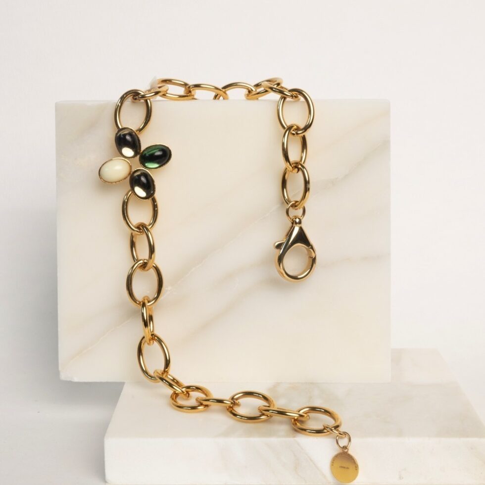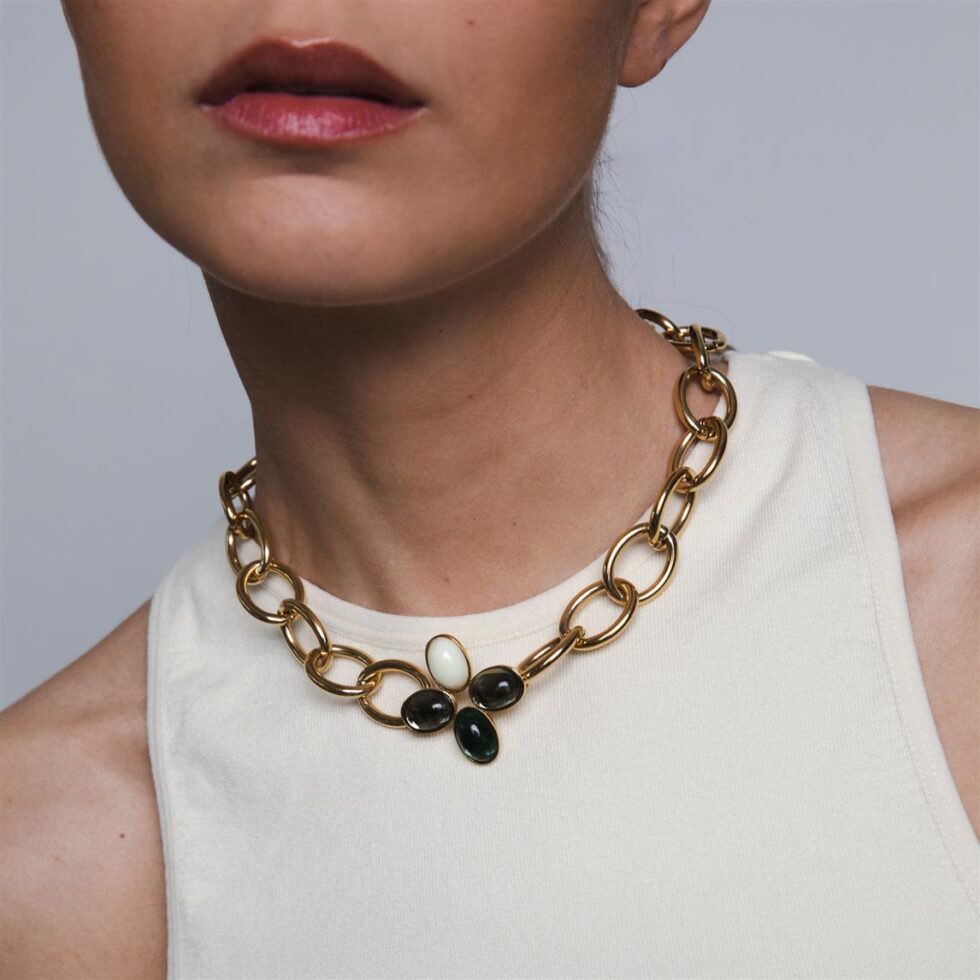 Reckoned by handmade colored glass stones from Czech Republic and set in a 24k gold plated brass frame – the Loulou link chain necklace is the ideal companion to enrich and accentuate your daily ventures. Inspired by the iconic Loulou de la Falaise, this necklace makes a breath of fresh air to express your truest self.