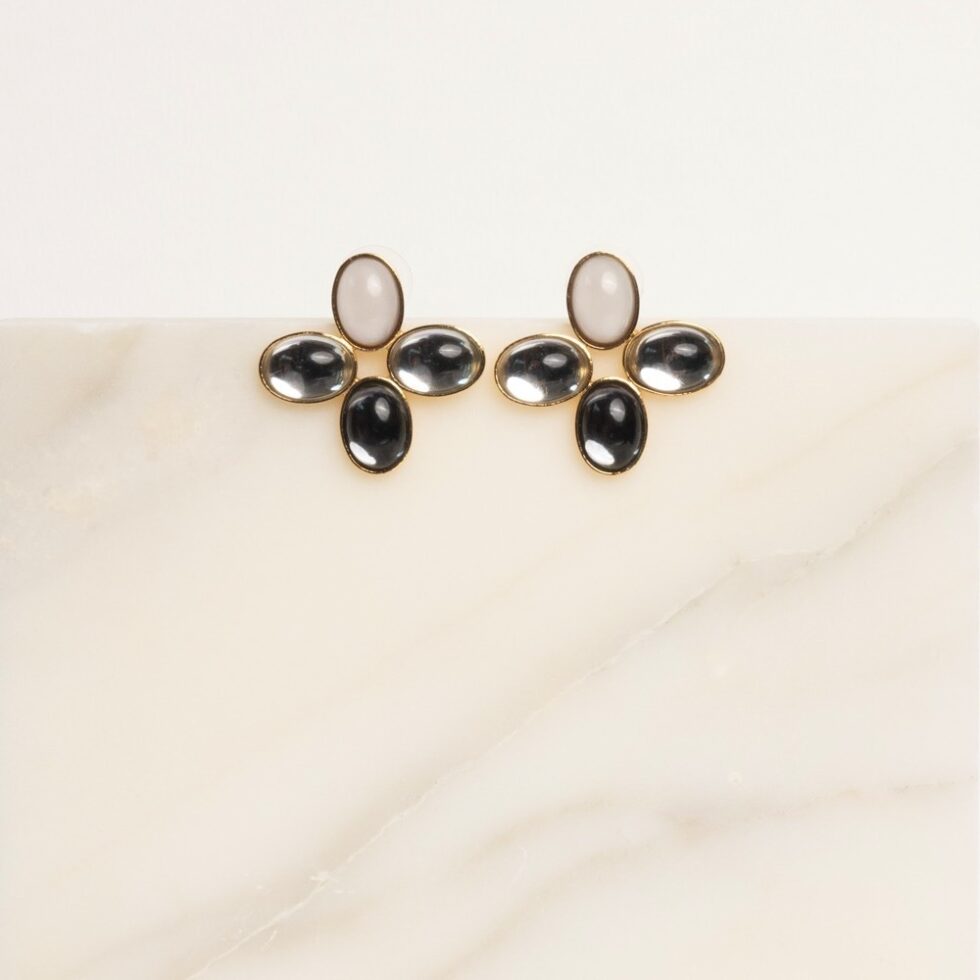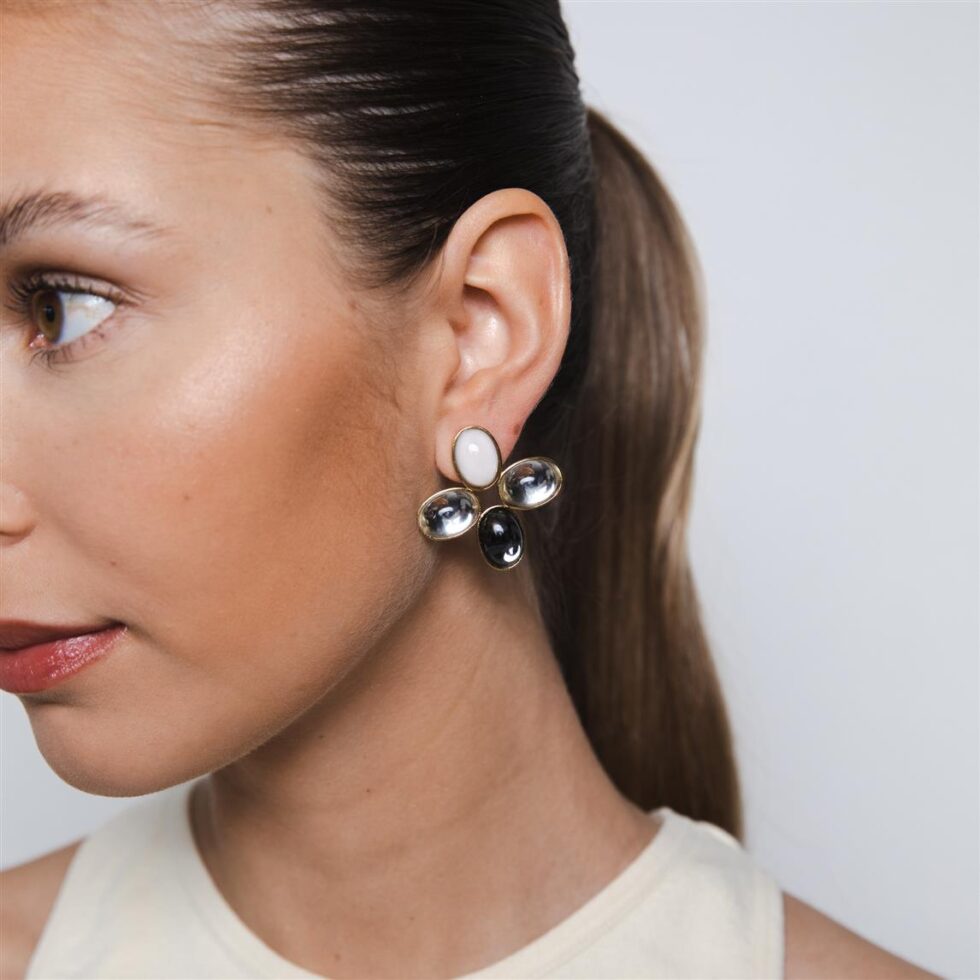 Precise and elegant in design, the Loulou earrings resemble femininity in its purest form. With its luxurious handmade glass stones and oval cabochons originating from Czech Republic, this piece is ought to take you to dreamy places. Diverse in color, each with a touch of fantasy and attitude – the Loulou makes a true icon of Souvenirs De Pomme.