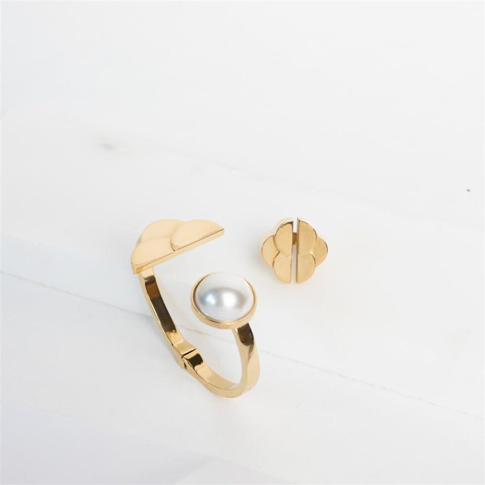 Sophisticated and precise – the Mae cuffs are sure to make a statement. Delicately handmade with gold plated brass, with at the bottom mesmerizing glass tones and timeless Italian resin pearls – these stunners are designed to make you feel as special as you look. Classy, yet with a sure touch of rebel.
