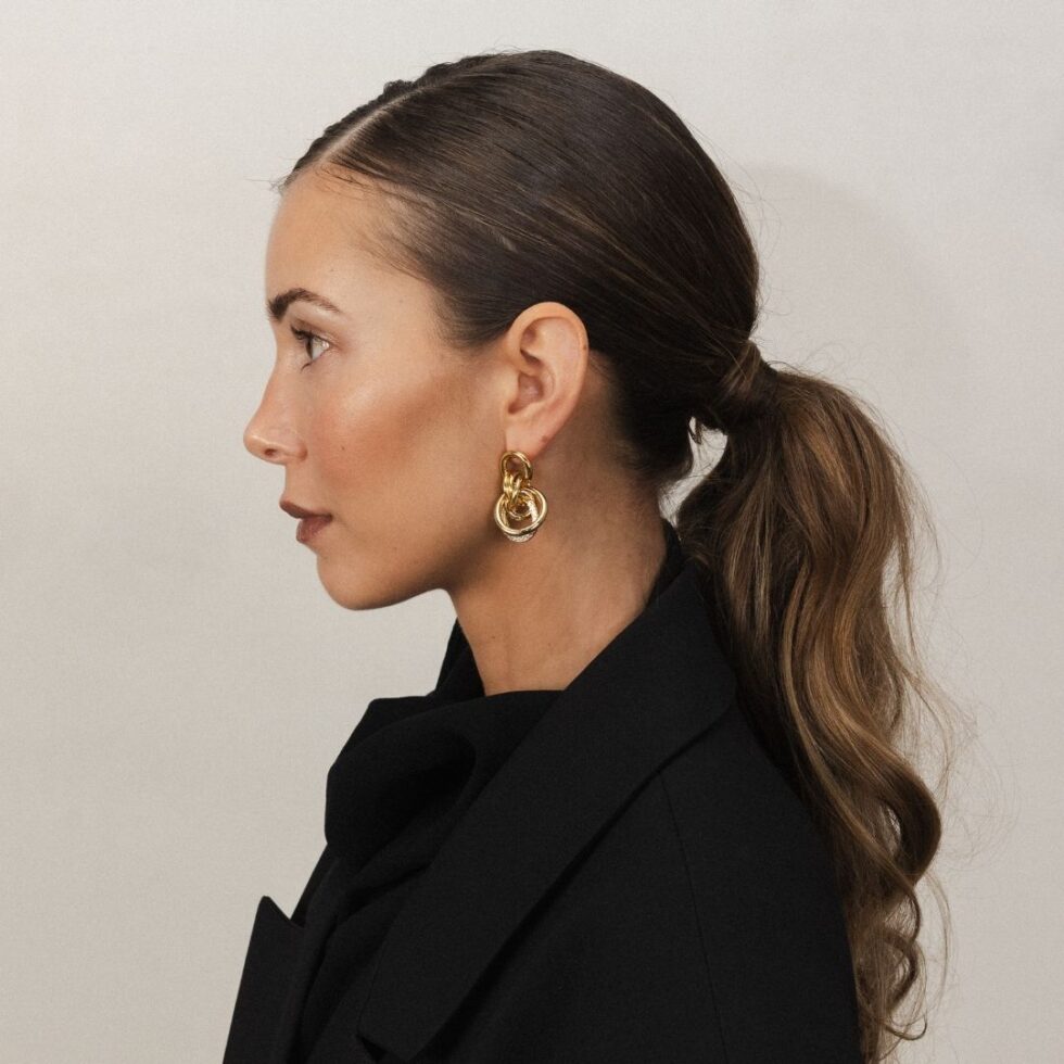 Make a luminous statement with our Maeve strass gold earrings, designed to combine sculptural elegance with refined sparkle. Featuring interlocking gold elements finished with a delicate circle of shimmering stones, these earrings create a graceful balance between bold structure and subtle brilliance.