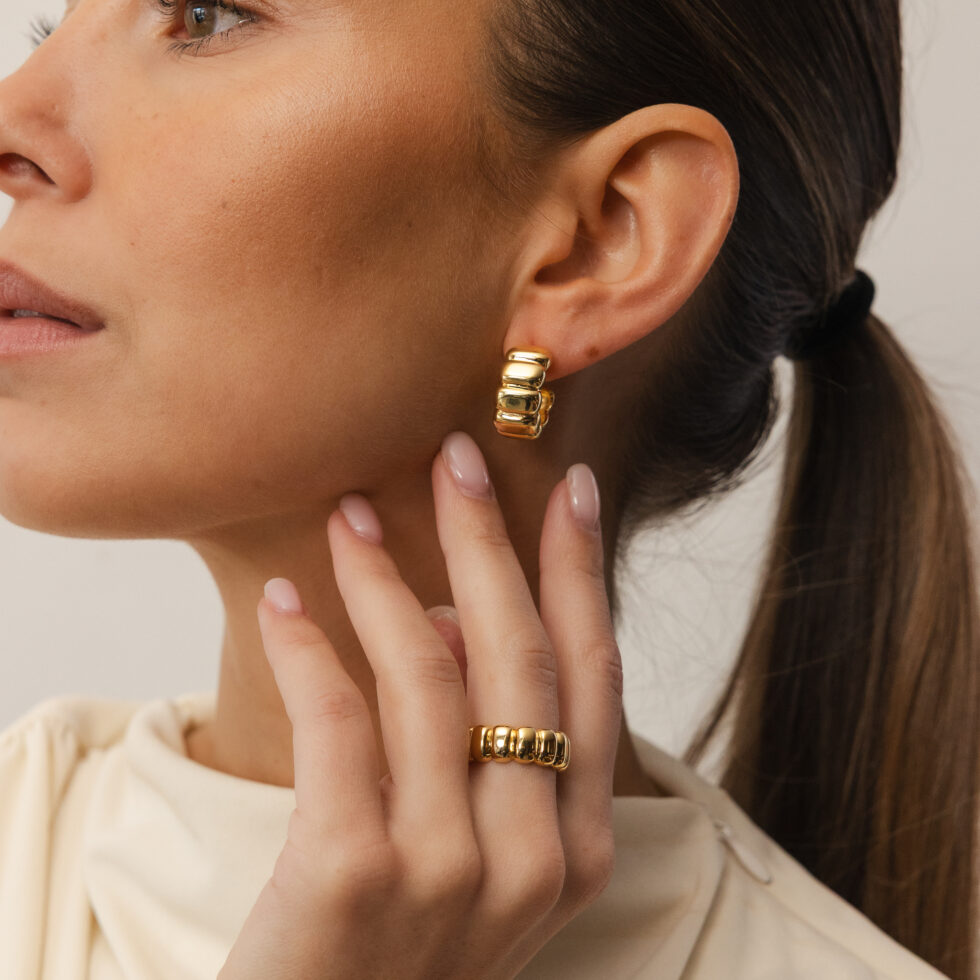 Crafted with precision and finished in a rich gold tone, these earrings offer a refined statement without overpowering your outfit. Their versatile design makes them perfect for daily wear as well as special occasions. Stack them with our silver version to create a bolder look.
