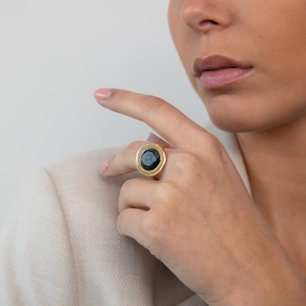 24K vergulde ring afgewerkt met een uniek en verfijnde rand voor een vintage look. Elke ring heeft onze herkenbare one-of-a-kind sprankelende gefacetteerde glassstenen. Draag deze ring apart of mix en match met andere kleuren.