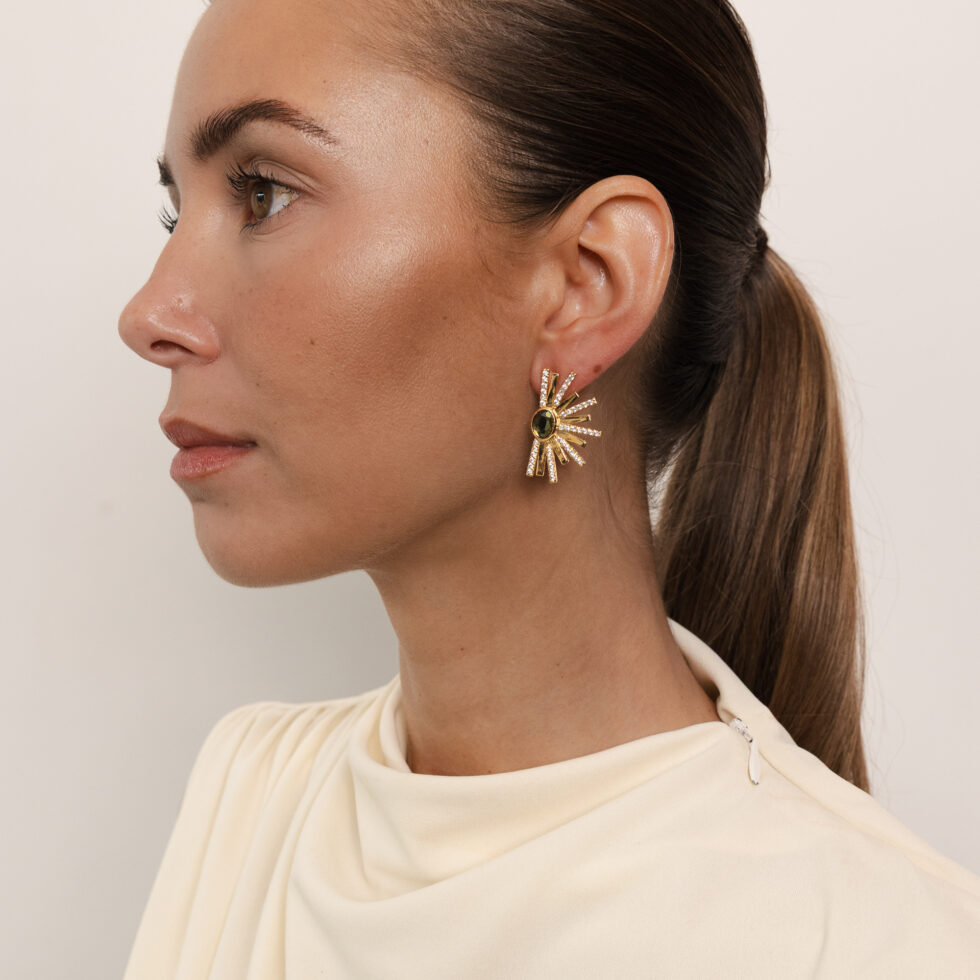 Radiate refined elegance with the Solea Short Earrings, a captivating fusion of modern artistry and timeless allure. Crafted with precision, each earring features a stunning arrangement of white zirconia stones that delicately catch the light, creating a dazzling sunburst effect.